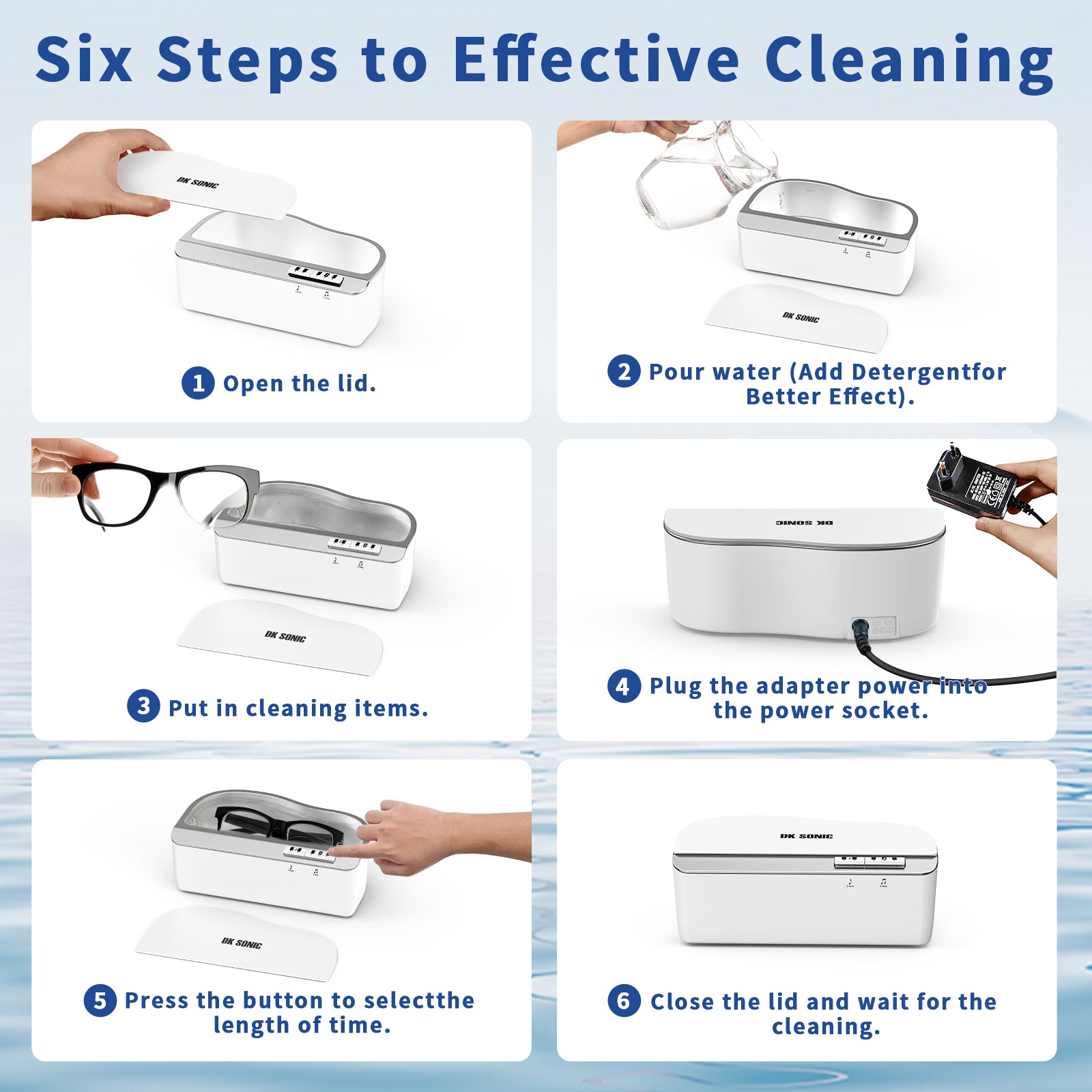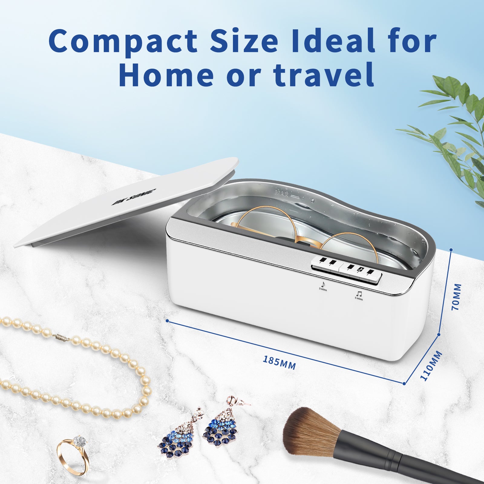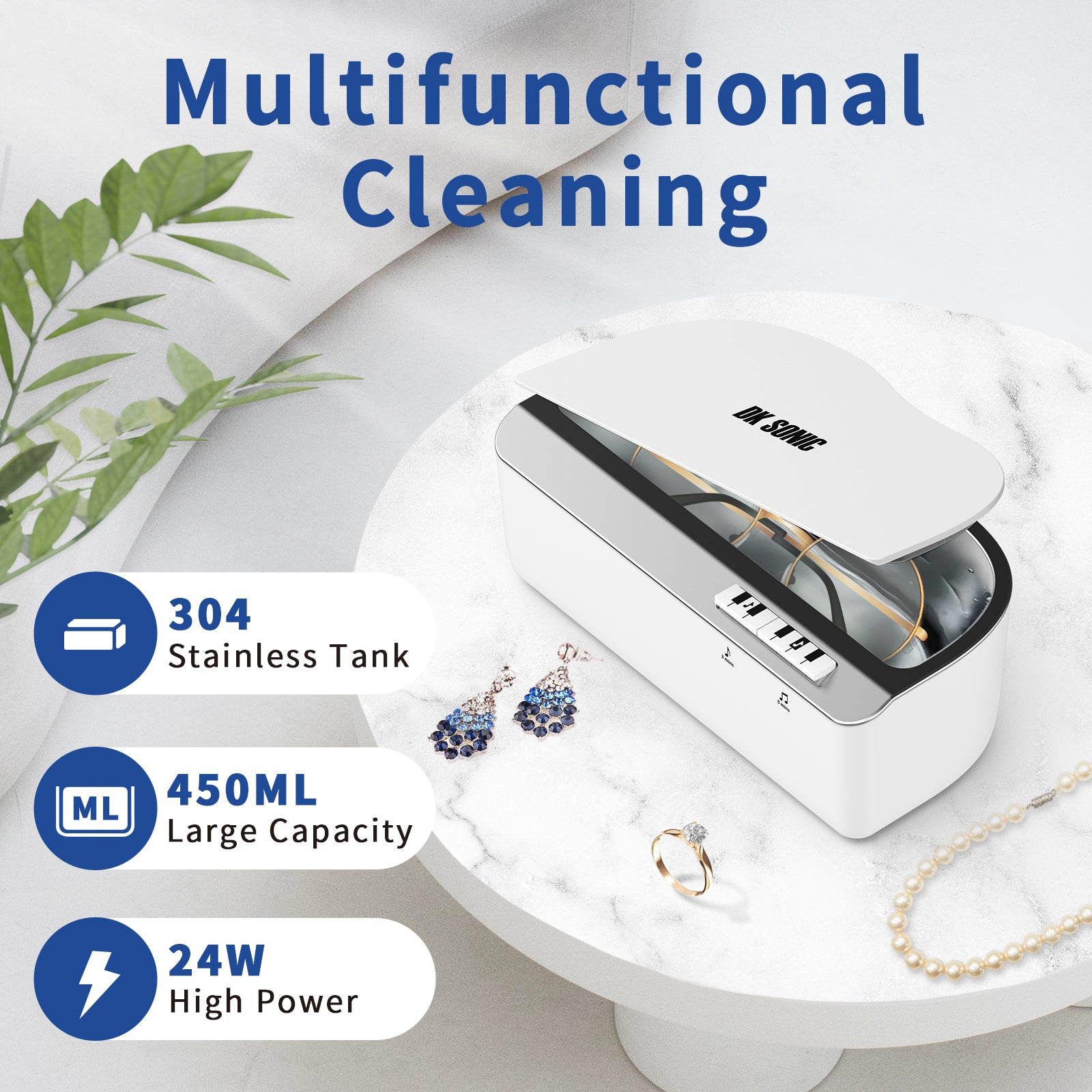 Ultrasonic cleaning machine has a large capacity of 450ml capacity which is enough to clean eyeglasses, rings, necklaces, silver, makeup brushes, delicate jewelry, and other items