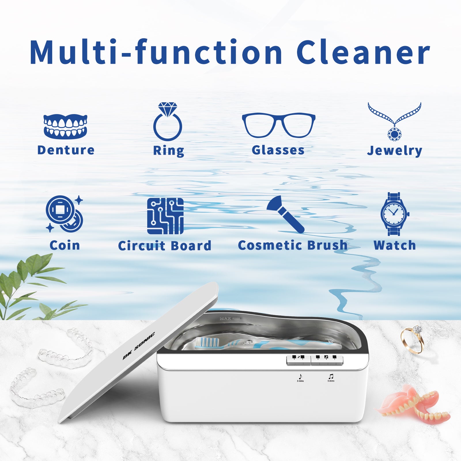 Ultrasonic cleaning one-button control easily controls two cleaning modes (3-minute standard cleaning, or 5-minute deep cleaning)