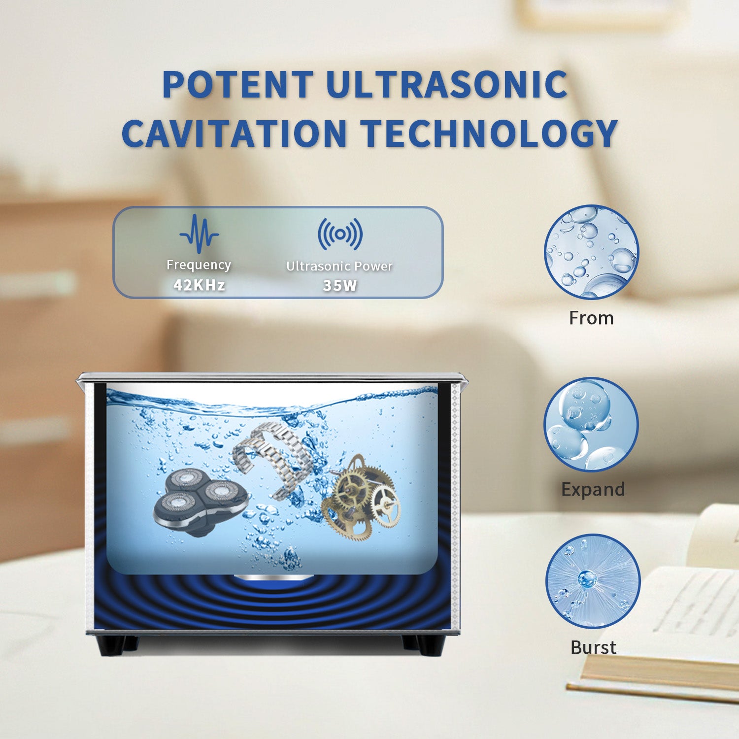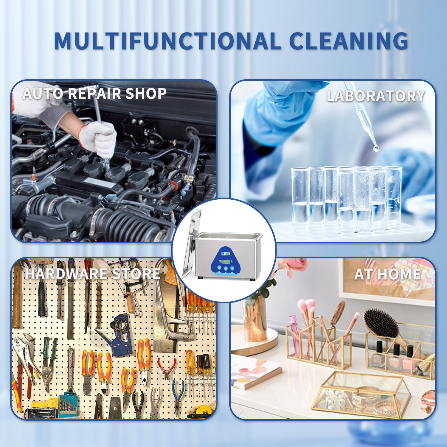 FULLWAVE mode(40KHz) for intensive rinse of blind holes or complicated surfaces; SEMIWAVE mode (semiwave based on 40KHz, i.e. 33KHz) for rough surface cleaning; DEGAS mode for removing ultrasonic fatigue so as to improve cleaning effect; PULSE mode for dynamic rinse of stubborn stains