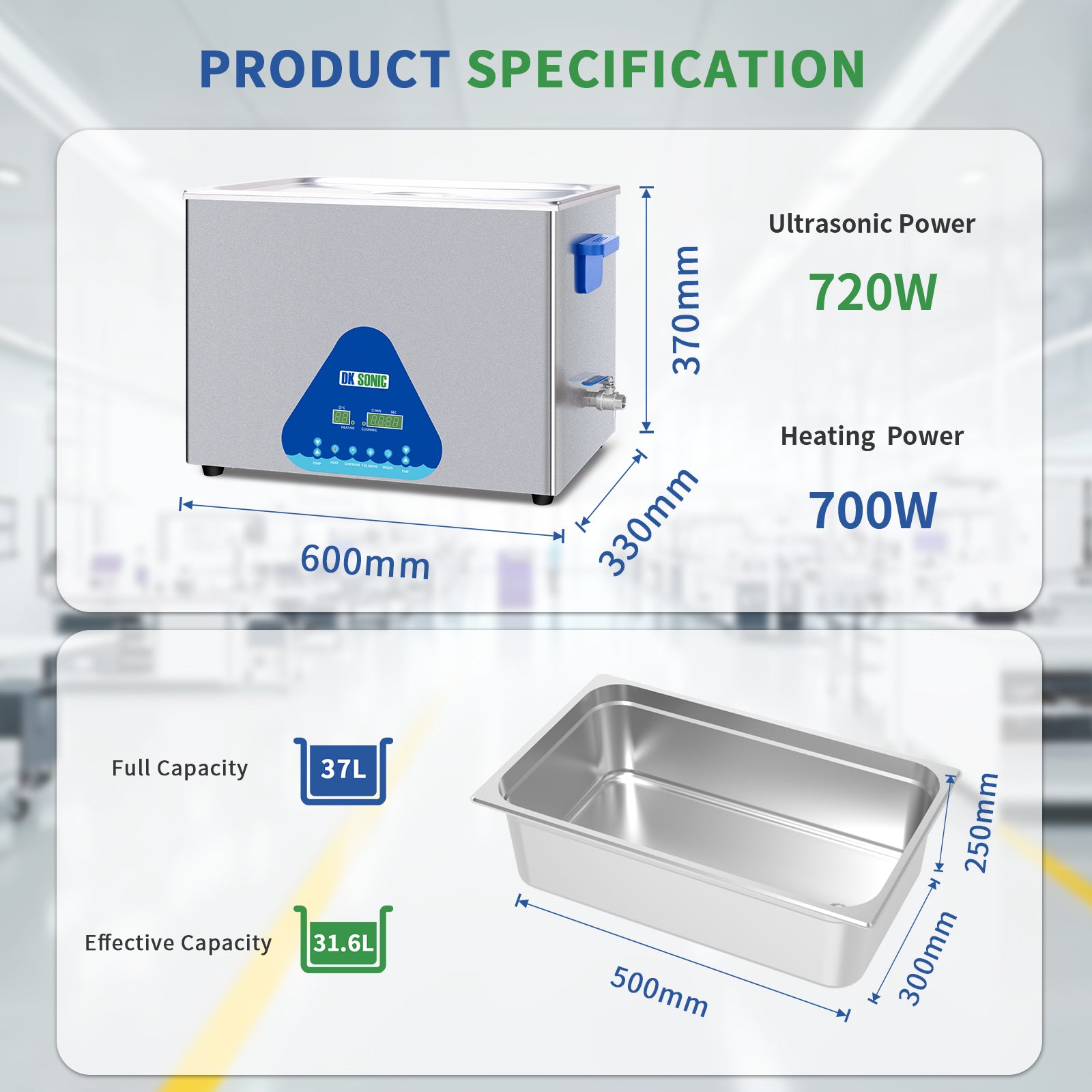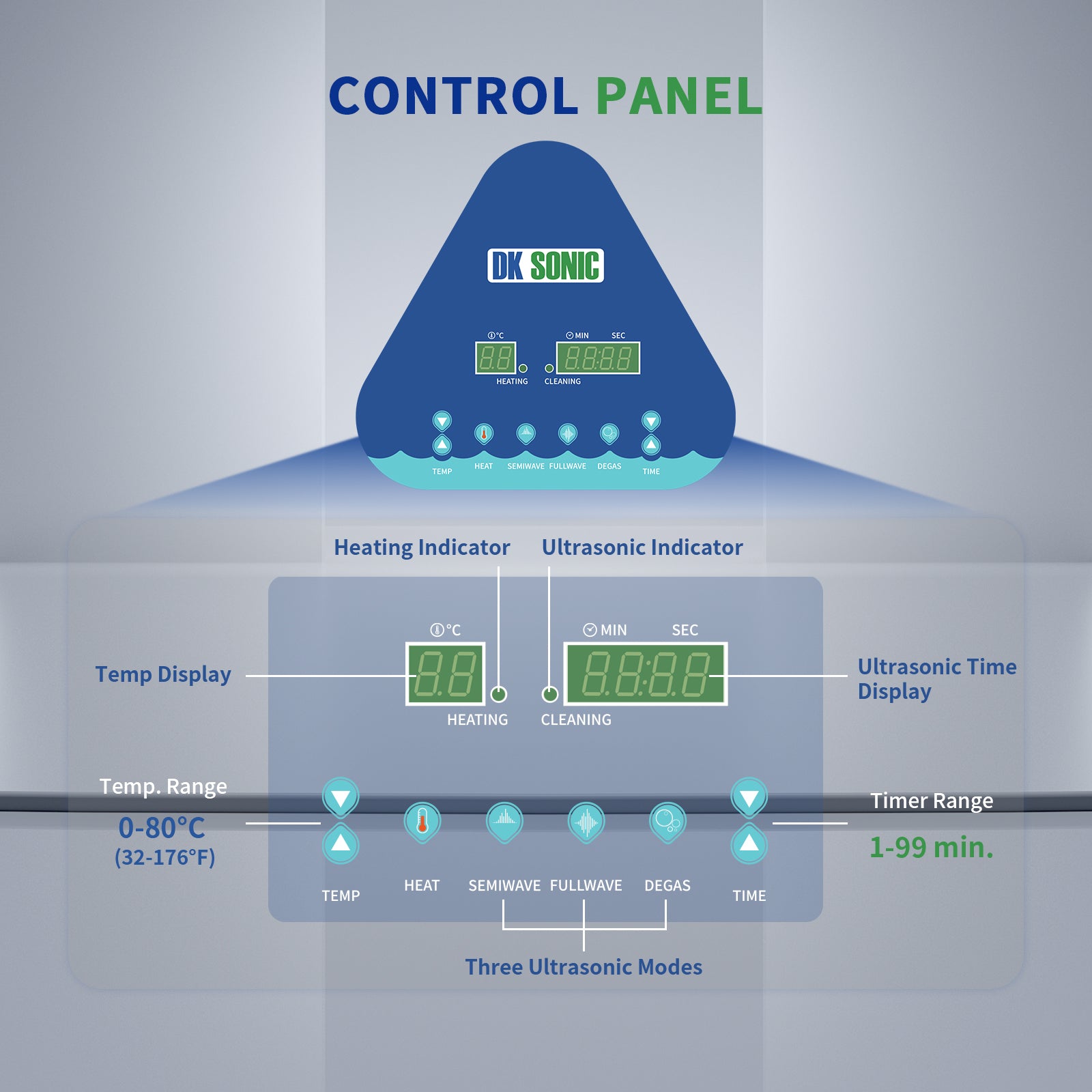 Mode FULLWAVE (40KHz) pour un rinçage intensif des trous aveugles ou des surfaces compliquées ; mode SEMIWAVE (semi-onde basée sur 40KHz, c'est-à-dire 33KHz) pour le nettoyage des surfaces rugueuses ; mode DEGAS pour éliminer la fatigue ultrasonique afin d'améliorer l'effet de nettoyage.