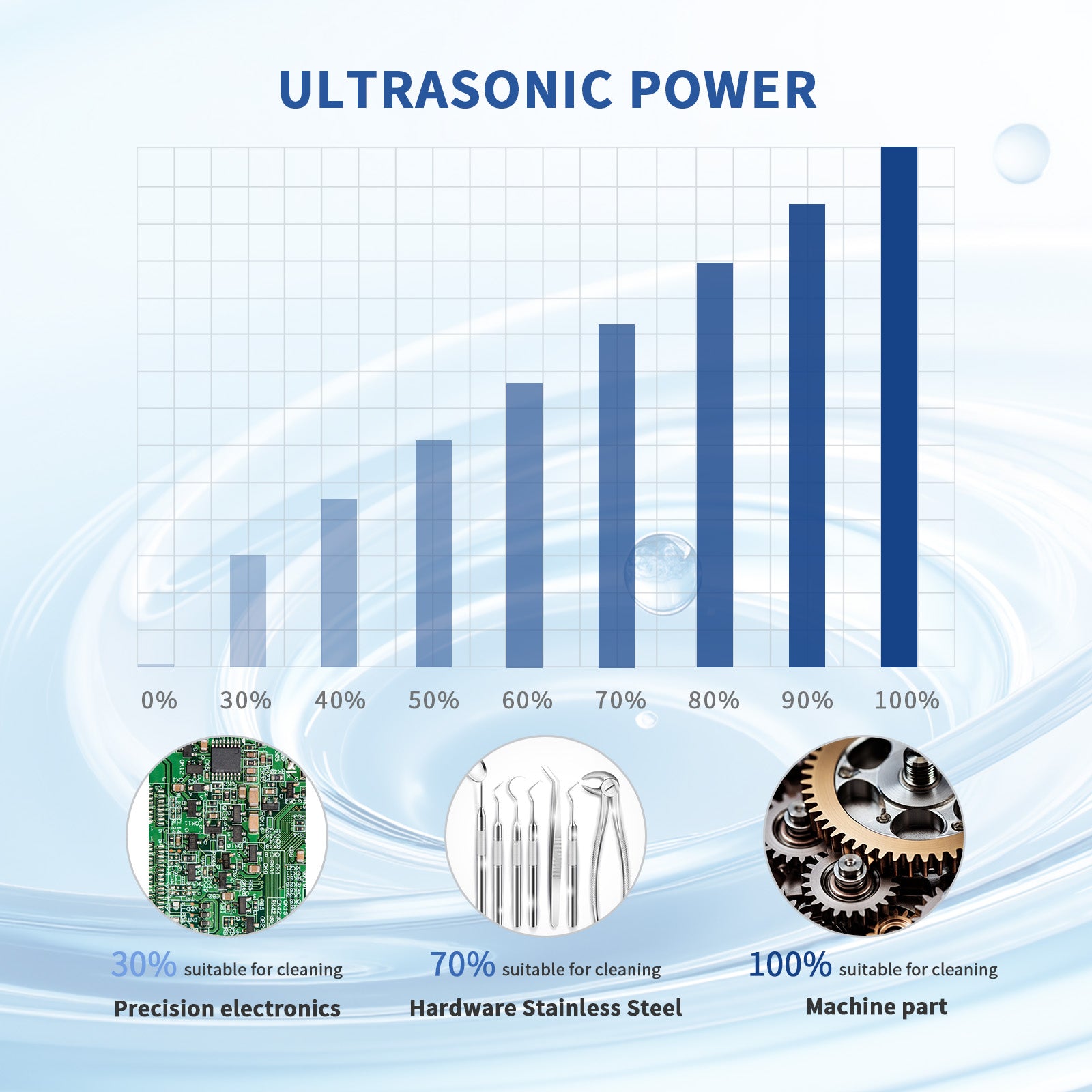 FULLWAVE mode(40KHz) for intensive rinse of blind holes or complicated surfaces; SEMIWAVE mode (semiwave based on 40KHz, i.e. 33KHz) for rough surface cleaning; DEGAS mode for removing ultrasonic fatigue so as to improve cleaning effect; PULSE mode for dynamic rinse of stubborn stains